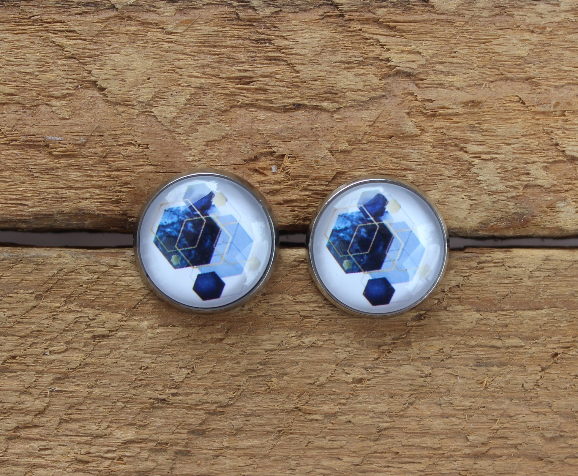 Petites merveilles hexagone bleu // blue hexagon earrings // cute glass cabochon (BO-1590)